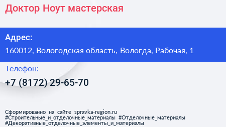Доктор Ноут, мастерская по адресу 160012, Вологодская область, Вологда, Рабочая, 1 в дальнейшем Организация, размещена в следующих категориях: