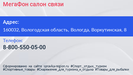 МегаФон, салон связи по адресу 160032, Вологодская область, Вологда, Воркутинская, 8 в дальнейшем Организация, размещена в следующих категориях: