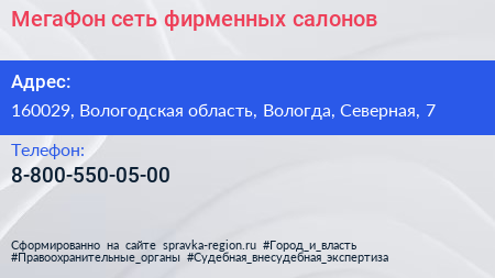 МегаФон, сеть фирменных салонов по адресу 160029, Вологодская область, Вологда, Северная, 7 в дальнейшем Организация, размещена в следующих категориях:
