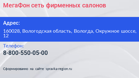 МегаФон, сеть фирменных салонов по адресу 160028, Вологодская область, Вологда, Окружное шоссе, 12 в дальнейшем Организация, размещена в следующих категориях: