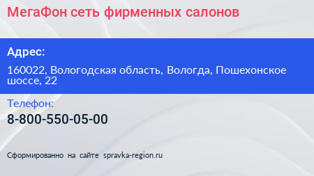 МегаФон, сеть фирменных салонов по адресу 160022, Вологодская область, Вологда, Пошехонское шоссе, 22 в дальнейшем Организация, размещена в следующих категориях: