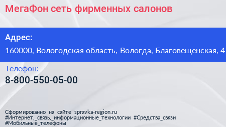 МегаФон, сеть фирменных салонов по адресу 160000, Вологодская область, Вологда, Благовещенская, 4 в дальнейшем Организация, размещена в следующих категориях: