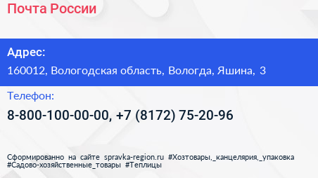 Почта России по адресу 160012, Вологодская область, Вологда, Яшина, 3 в дальнейшем Организация, размещена в следующих категориях: