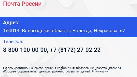 Почта России по адресу 160014, Вологодская область, Вологда, Некрасова, 67 в дальнейшем Организация, размещена в следующих категориях: