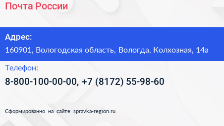 Почта России по адресу 160901, Вологодская область, Вологда, Колхозная, 14а в дальнейшем Организация, размещена в следующих категориях: