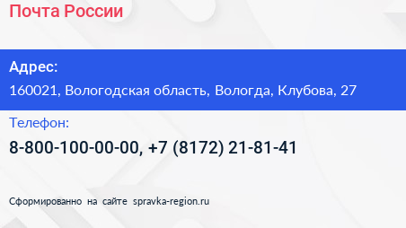Почта России по адресу 160021, Вологодская область, Вологда, Клубова, 27 в дальнейшем Организация, размещена в следующих категориях: