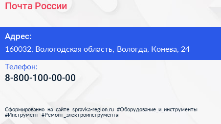 Почта России по адресу 160032, Вологодская область, Вологда, Конева, 24 в дальнейшем Организация, размещена в следующих категориях: