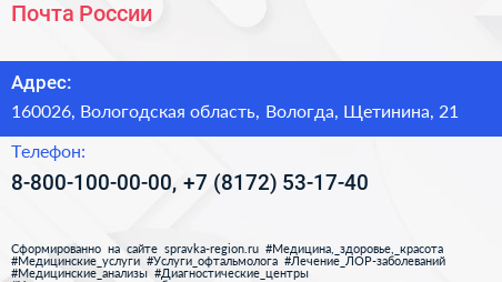 Почта России по адресу 160026, Вологодская область, Вологда, Щетинина, 21 в дальнейшем Организация, размещена в следующих категориях: