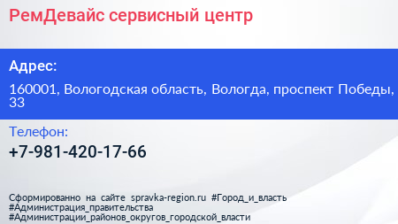 РемДевайс, сервисный центр по адресу 160001, Вологодская область, Вологда, проспект Победы, 33 в дальнейшем Организация, размещена в следующих категориях: