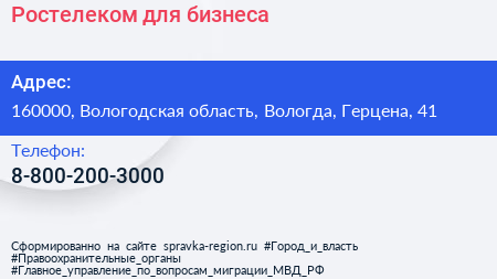 Ростелеком для бизнеса по адресу 160000, Вологодская область, Вологда, Герцена, 41 в дальнейшем Организация, размещена в следующих категориях: