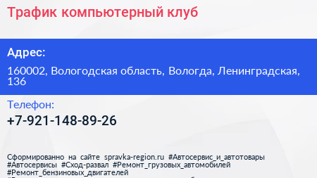 Трафик, компьютерный клуб по адресу 160002, Вологодская область, Вологда, Ленинградская, 136 в дальнейшем Организация, размещена в следующих категориях: