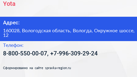 Yota по адресу 160028, Вологодская область, Вологда, Окружное шоссе, 12 в дальнейшем Организация, размещена в следующих категориях:
