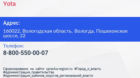Yota по адресу 160022, Вологодская область, Вологда, Пошехонское шоссе, 22 в дальнейшем Организация, размещена в следующих категориях: