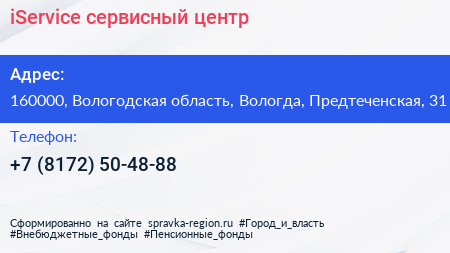 iService, сервисный центр по адресу 160000, Вологодская область, Вологда, Предтеченская, 31 в дальнейшем Организация, размещена в следующих категориях: