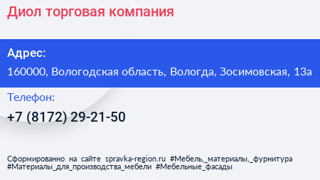 Диол, торговая компания по адресу 160000, Вологодская область, Вологда, Зосимовская, 13а в дальнейшем Организация, размещена в следующих категориях: