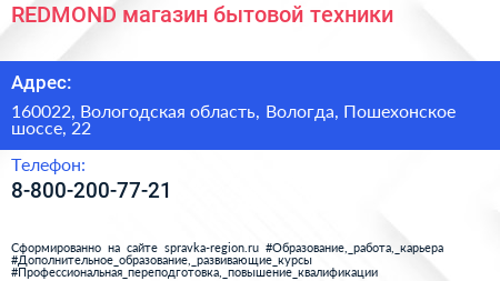 REDMOND, магазин бытовой техники по адресу 160022, Вологодская область, Вологда, Пошехонское шоссе, 22 в дальнейшем Организация, размещена в следующих категориях: