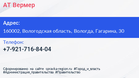 АТ Вермер по адресу 160002, Вологодская область, Вологда, Гагарина, 30 в дальнейшем Организация, размещена в следующих категориях: