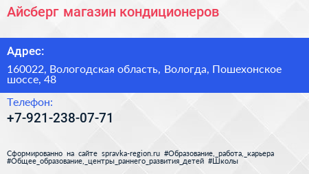 Айсберг, магазин кондиционеров по адресу 160022, Вологодская область, Вологда, Пошехонское шоссе, 48 в дальнейшем Организация, размещена в следующих категориях:
