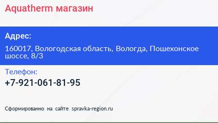 Aquatherm, магазин по адресу 160017, Вологодская область, Вологда, Пошехонское шоссе, 8/3 в дальнейшем Организация, размещена в следующих категориях: