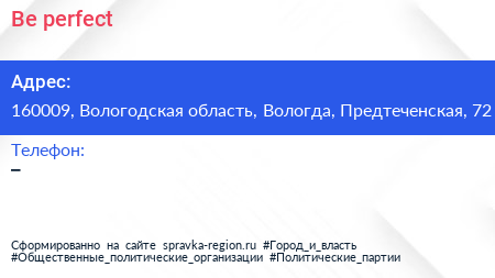 Be perfect по адресу 160009, Вологодская область, Вологда, Предтеченская, 72 в дальнейшем Организация, размещена в следующих категориях: