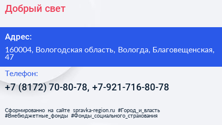 Добрый свет по адресу 160004, Вологодская область, Вологда, Благовещенская, 47 в дальнейшем Организация, размещена в следующих категориях: