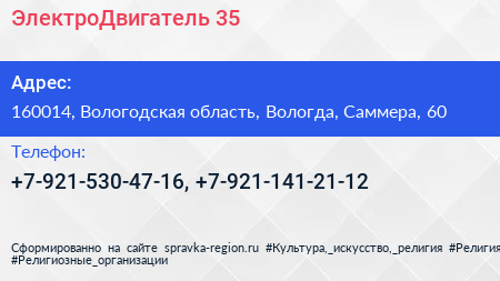 ЭлектроДвигатель 35 по адресу 160014, Вологодская область, Вологда, Саммера, 60 в дальнейшем Организация, размещена в следующих категориях: