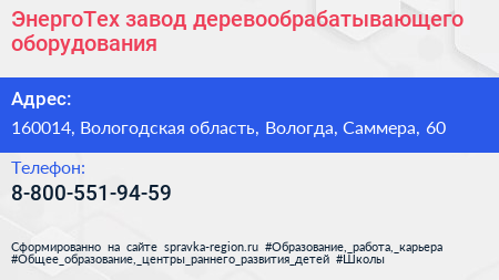 ЭнергоТех, завод деревообрабатывающего оборудования по адресу 160014, Вологодская область, Вологда, Саммера, 60 в дальнейшем Организация, размещена в следующих категориях: