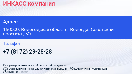 ИНКАСС, компания по адресу 160000, Вологодская область, Вологда, Советский проспект, 50 в дальнейшем Организация, размещена в следующих категориях: