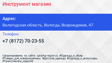 Инструмент, магазин по адресу Вологодская область, Вологда, Возрождения, 47 в дальнейшем Организация, размещена в следующих категориях: