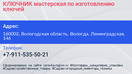 КЛЮЧНИК, мастерская по изготовлению ключей по адресу 160002, Вологодская область, Вологда, Ленинградская, 146 в дальнейшем Организация, размещена в следующих категориях: