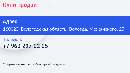 Купи-продай по адресу 160023, Вологодская область, Вологда, Можайского, 25 в дальнейшем Организация, размещена в следующих категориях: