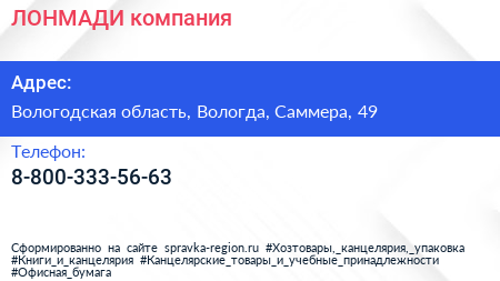 ЛОНМАДИ, компания по адресу Вологодская область, Вологда, Саммера, 49 в дальнейшем Организация, размещена в следующих категориях: