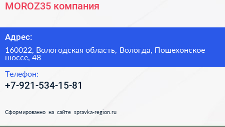 MOROZ35, компания по адресу 160022, Вологодская область, Вологда, Пошехонское шоссе, 48 в дальнейшем Организация, размещена в следующих категориях: