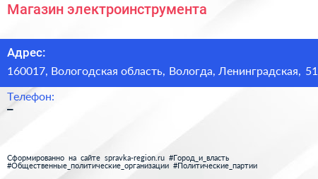 Магазин электроинструмента по адресу 160017, Вологодская область, Вологда, Ленинградская, 51 в дальнейшем Организация, размещена в следующих категориях: