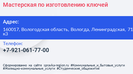 Мастерская по изготовлению ключей по адресу 160017, Вологодская область, Вологда, Ленинградская, 71 к3 в дальнейшем Организация, размещена в следующих категориях: