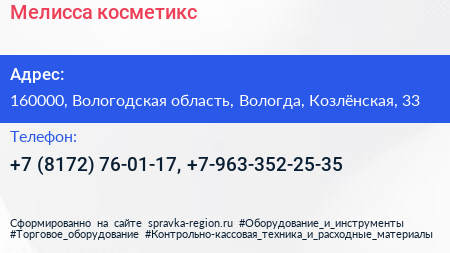 Мелисса-косметикс по адресу 160000, Вологодская область, Вологда, Козлёнская, 33 в дальнейшем Организация, размещена в следующих категориях: