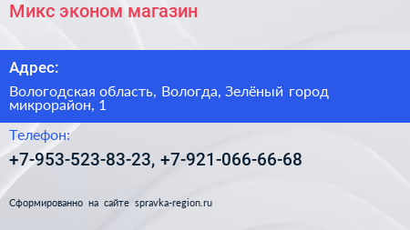 Микс, эконом-магазин по адресу Вологодская область, Вологда, Зелёный город микрорайон, 1 в дальнейшем Организация, размещена в следующих категориях:
