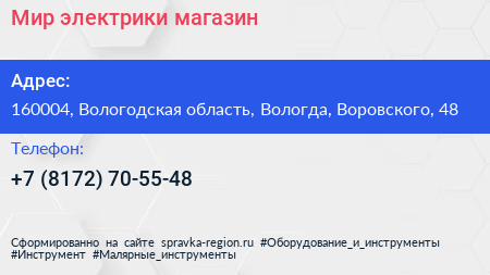 Мир электрики, магазин по адресу 160004, Вологодская область, Вологда, Воровского, 48 в дальнейшем Организация, размещена в следующих категориях: