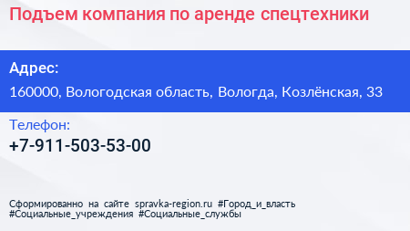 Подъем, компания по аренде спецтехники по адресу 160000, Вологодская область, Вологда, Козлёнская, 33 в дальнейшем Организация, размещена в следующих категориях: