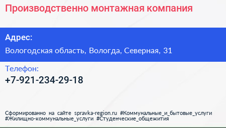 Производственно-монтажная компания по адресу Вологодская область, Вологда, Северная, 31 в дальнейшем Организация, размещена в следующих категориях: