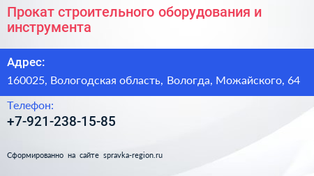Прокат строительного оборудования и инструмента по адресу 160025, Вологодская область, Вологда, Можайского, 64 в дальнейшем Организация, размещена в следующих категориях: