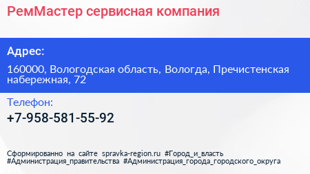 РемМастер, сервисная компания по адресу 160000, Вологодская область, Вологда, Пречистенская набережная, 72 в дальнейшем Организация, размещена в следующих категориях: