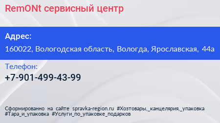 RemONt, сервисный центр по адресу 160022, Вологодская область, Вологда, Ярославская, 44а в дальнейшем Организация, размещена в следующих категориях:
