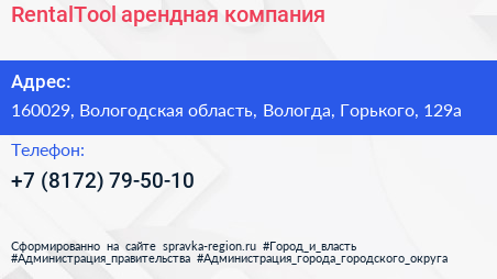 RentalTool, арендная компания по адресу 160029, Вологодская область, Вологда, Горького, 129а в дальнейшем Организация, размещена в следующих категориях:
