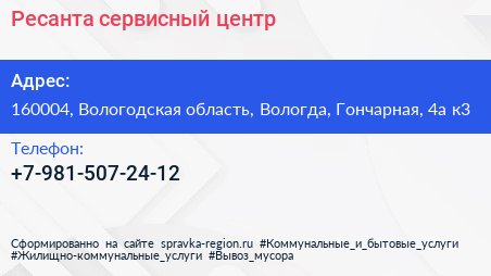 Ресанта, сервисный центр по адресу 160004, Вологодская область, Вологда, Гончарная, 4а к3 в дальнейшем Организация, размещена в следующих категориях: