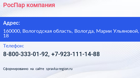 РосПар, компания по адресу 160000, Вологодская область, Вологда, Марии Ульяновой, 18 в дальнейшем Организация, размещена в следующих категориях: