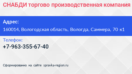 СНАБДИ, торгово-производственная компания по адресу 160014, Вологодская область, Вологда, Саммера, 70 к1 в дальнейшем Организация, размещена в следующих категориях: