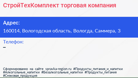 СтройТехКомплект, торговая компания по адресу 160014, Вологодская область, Вологда, Саммера, 3 в дальнейшем Организация, размещена в следующих категориях: