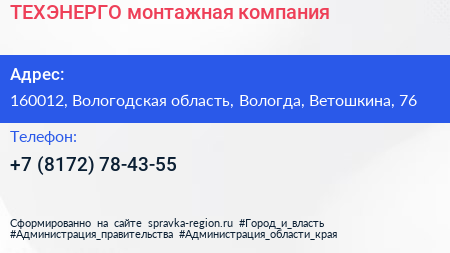 ТЕХЭНЕРГО, монтажная компания по адресу 160012, Вологодская область, Вологда, Ветошкина, 76 в дальнейшем Организация, размещена в следующих категориях: