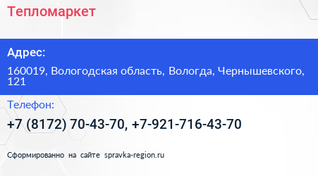 Тепломаркет по адресу 160019, Вологодская область, Вологда, Чернышевского, 121 в дальнейшем Организация, размещена в следующих категориях: